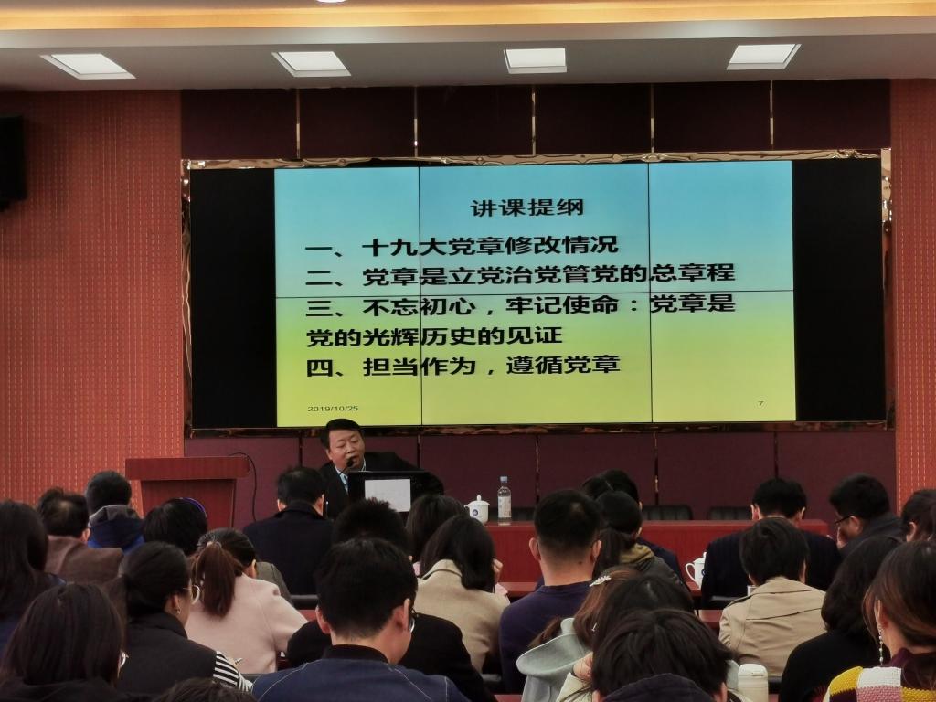 根据对党的建设的调查研究结果,为提升学院政治站位,提高学院政治觉悟和政治敏锐力,增强学院党员的宗旨意识,10月25日上午,党委书记谢德仁在文澜楼A区F347报告厅为学院全体师生党员做了题为“不忘初心学习党章,担当作为遵守党章”的专题党课,带领全院党员一起集体学习《中国共产党章程》,重温初心,坚定信仰。学校主题教育督导组成员、学生处副处长王超参加党课。 谢德仁围绕十九大党章修改情况、党章是立党管党治党的...
