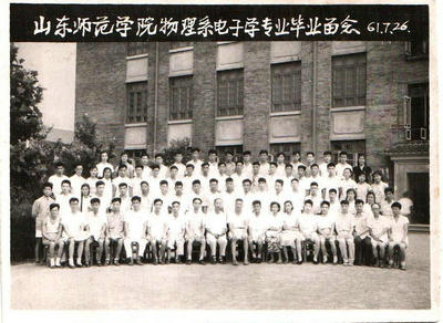 1960年毛泽东主席来济南视查时,还到珍珠泉参观了学校科技展,特别听取了物理系科研成果的汇报。这一时期,学校的成人教育发展迅速。1956年有3个系开始招收函授生,1958年就发展成6个系可招函授生。物理系自1958年至1964年,每年招收函授学历专科生(3年制)和本科生(2.5年~5年制),并且招生人数逐年增加。1959年学校有四个系开始招收夜大学历生。物理系自1959年制1965年,每年招收夜大学历专科生(3年制)和本科生(5年制)。