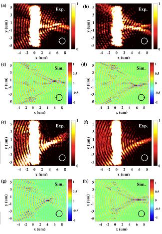 表面等离激元(Surface Plasmon Polaritons,SPPs)场是局域在金属与电介质二维分界面传播的电磁振荡,具有亚波长、场局域和场增强特性。灵活调控SPPs在二维平面内的传播与分布,可以有效的促进SPPs在微纳加工、太阳能和生物医疗等领域中的应用。传统的SPPs场调控通常是基于传播相位或几何相位,但这两种方法分别受到空间共轭性和自旋共轭性的限制。通过二者的耦合可以打破共轭性的限制,实现更加灵活的SPPs场调控。基于传播透镜相位与线性梯度几何相位、透镜几何相位的复合,作者提出并实现了一种具有类似光子自旋霍尔效应的复合SPPs透镜,通过改变入射光的手性可以实现任意距离的SPPs焦点的横向或纵向分离。该工作相关成果在片上通信与偏振检测等方向具有潜在的应用。