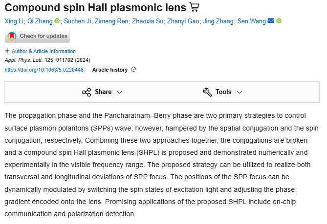 近日,K云体育官方入口王森老师课题组在应用物理学知名期刊《Applied Physics Letters》上发表了题为“Compound Spin Hall Plasmonic Lens”的学术论文。K云体育官方入口为论文唯一署名单位,李杏老师为论文第一作者,王森老师为论文通讯作者。