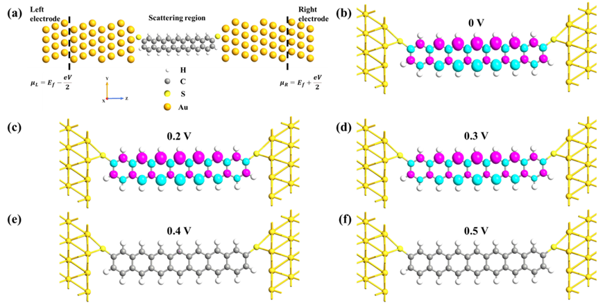 作为典型的有机π共轭分子,并苯分子在有机发光和分子电子学领域受到广泛关注。相关实验和理论表明,并苯分子具有独特的长度依赖的磁特性。当苯环个数达到或超过7时,分子基态将由非磁态转变为反铁磁态,在有机反铁磁器件及输运方面具有潜在的应用价值。然而,在器件结构形式下,电极耦合和外加偏压是不可避免的因素,此时并苯分子能否保持反铁磁性值得探究。在本工作中,作者基于第一性原理方法,研究了偏压对连接到金电极上的并七苯分子磁性的影响。研究发现,并七苯分子连接到金电极后,未加偏压时可保持反铁磁自旋密度波(亚铁磁性)。当偏压超过一临界值时,并七苯由磁性向非磁性转变。进一步研究表明,该磁性-非磁转变源于偏压引起的电子态定域度变化,导致分子磁性的主导机制由电子间的库仑相互作用转变为电子平均跃迁速率。计算表明,并八苯和并九苯分子也存在类似现象。