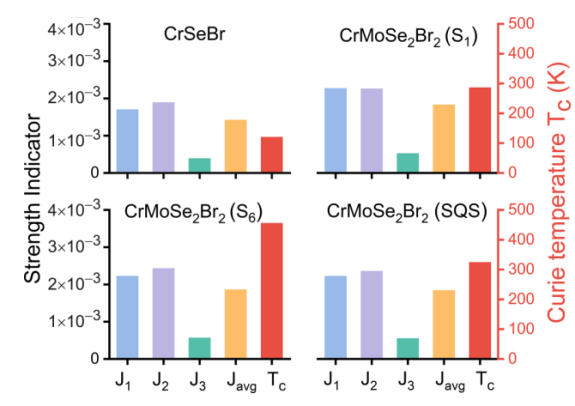 对于二维磁性半导体,合金策略有望通过增强铁磁超交换相互作用来提升其居里温度。本文以半导体合金CrMoSe2Br2为例,研究了完全有序、部分有序和完全无序三种情形下的超交换作用强度,进而提出合金无序程度(阳离子无序程度)可以作为一种调控二维磁性半导体合金中超交换相互作用强度和居里温度的手段。