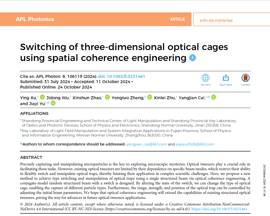 近日,K云体育官方入口光场调控及应用中心蔡阳健教授团队在物理类一区期刊《APL Photonics》上发表题为“Switching of three-dimensional optical cages using spatial coherence engineering”的研究论文,该论文被评选为“Featured Article”。山东师范大学为第一署名单位,博士研究生徐颖为论文第一作者,蔡阳健教授和余佳益副教授为论文通讯作者。