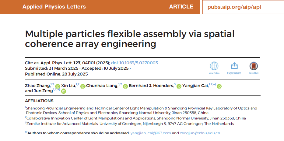 近日,K云体育官方入口、山东师范大学光场调控及应用中心蔡阳健教授团队与荷兰格罗宁根大学Bernhard J. Hoenders教授在自然指数期刊《Applied Physics Letters》上合作发表了题为“Multiple particles flexible assembly via spatial coherence array engineering”的研究论文。山东师范大学为第一署名单位,博士研究生张钊为论文第一作者,蔡阳健教授和曾军副教授为论文通讯作者。
