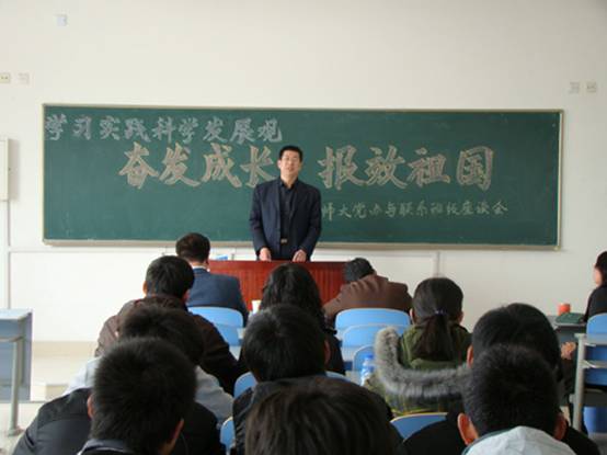3月27日下午,学校党办与联系班级----物电学院07级电子信息工程1班,在长清校区综合教学楼B区334室召开座谈会,座谈会主题是“学习实践科学发展观,奋发有为,报效祖国”。