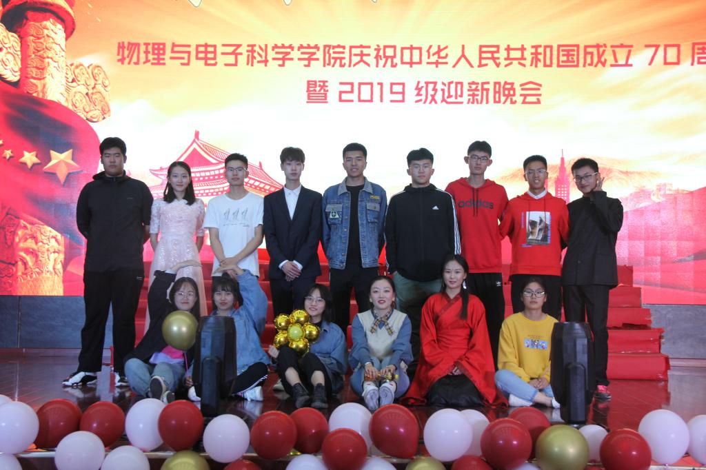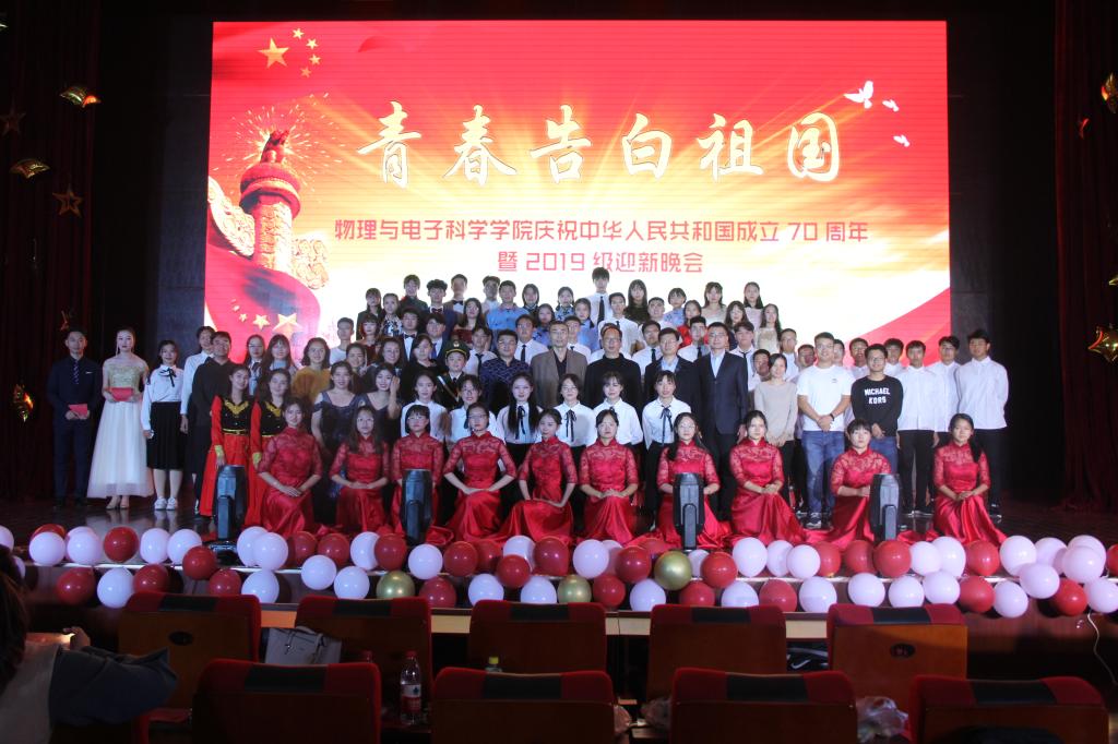 10月24日,物理与电子科学学院于长清湖校区树惠堂举办“青春告白祖国”庆祝中华人民共和国成立70周年暨2019级迎新晚会。学校研究生工作部副部长王庆荣、物理与电子科学学院院长蔡阳健,党委副书记杜伟,副院长赵曰峰、任俊峰、宋玉志,学院教师代表及全体辅导员出席活动,2019级300余名新生观看晚会。