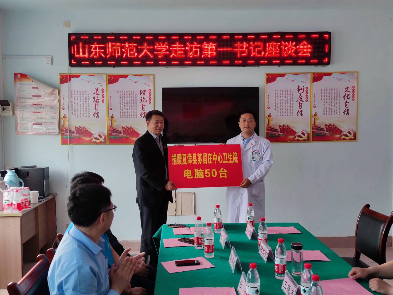 第一书记座谈会在夏津县苏留庄中心卫生院召开,物电学院一行与夏津县卫计委副主任张荣娥、第一书记王晓声、王奎锋、丁同楼、段超,卫生院院长宋明芹座谈交流。经学校同意,谢德仁代表物电学院向苏留庄中心卫生院捐赠50台办公电脑,助力基层农村疫情防控和脱贫攻坚,卫生院院长宋明芹向物电学院回赠了感谢牌匾。