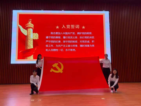 上午8时,全体党员身着正装,佩戴党徽,认真观看大会现场直播。伴随着100响礼炮响彻云霄,庆祝大会正式开始。在场师生全体肃立,目视国旗护卫队官兵护卫五星红旗行至升旗区,当奏响《义勇军进行曲》时,全场高唱中华人民共和国国歌,注视着五星红旗冉冉升起。习近平发表重要讲话,代表党和人民庄严宣告:“经过全党全国各族人民持续奋斗,我们实现了第一个百年奋斗目标,在中华大地上全面建成了小康社会”。与会师生的骄傲、自豪之情油然而生,报告厅内不时响起热烈掌声。