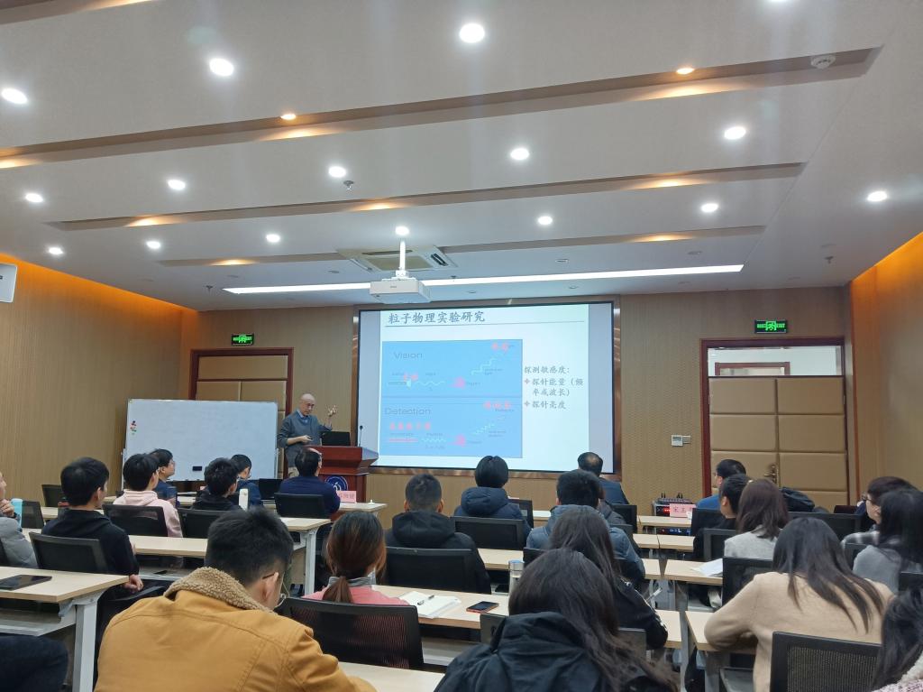 满宝元向主讲嘉宾颁发“东渐讲坛”奖杯,对嘉宾的到来表示欢迎和感谢。郑阳恒作《北京正负电子对撞机BESIII实验研究简介及展望》报告,以时间顺序简述北京正负电子对撞机BESIII实验的发展。他从合作组的壮大、论文发表量浅谈了实验研究近年来的成绩,深入浅出地引出了特色物理亮点——高统计量、低本底。他将探测机类比眼睛,循循善诱地启发观众思考,加入实际生活事例使论述更为易懂,阐明粒子物理对互联网网络计算、加速器、辐照探测、快/微电子学等多项技术具有推动进步作用,在海量数据管理、石油探测、医学成像、海洋监测等领域具有广泛应用。郑阳恒对北京正负电子对撞机BESIII实验研究提出了展望,并介绍了北京正负电子对撞机BESIII实验研究的升级计划、国际合作、初步路线、时间表、经费计算,表示研究的启动了推进我国下一代高亮度正负电子对撞实验“超级tau-粲装置”项目的计划。报告结束后,与会师生同嘉宾进行了深入细致的学术交流。