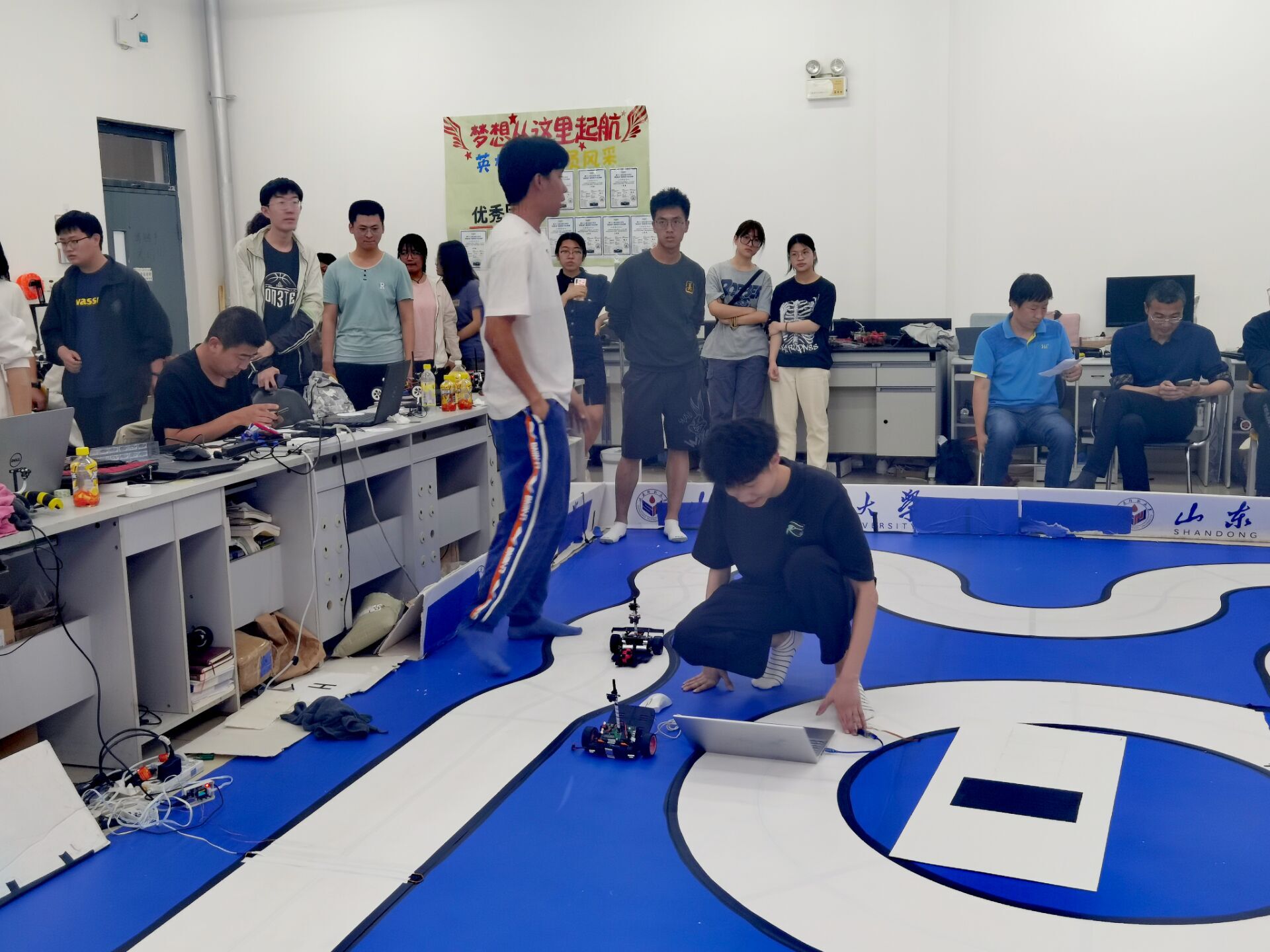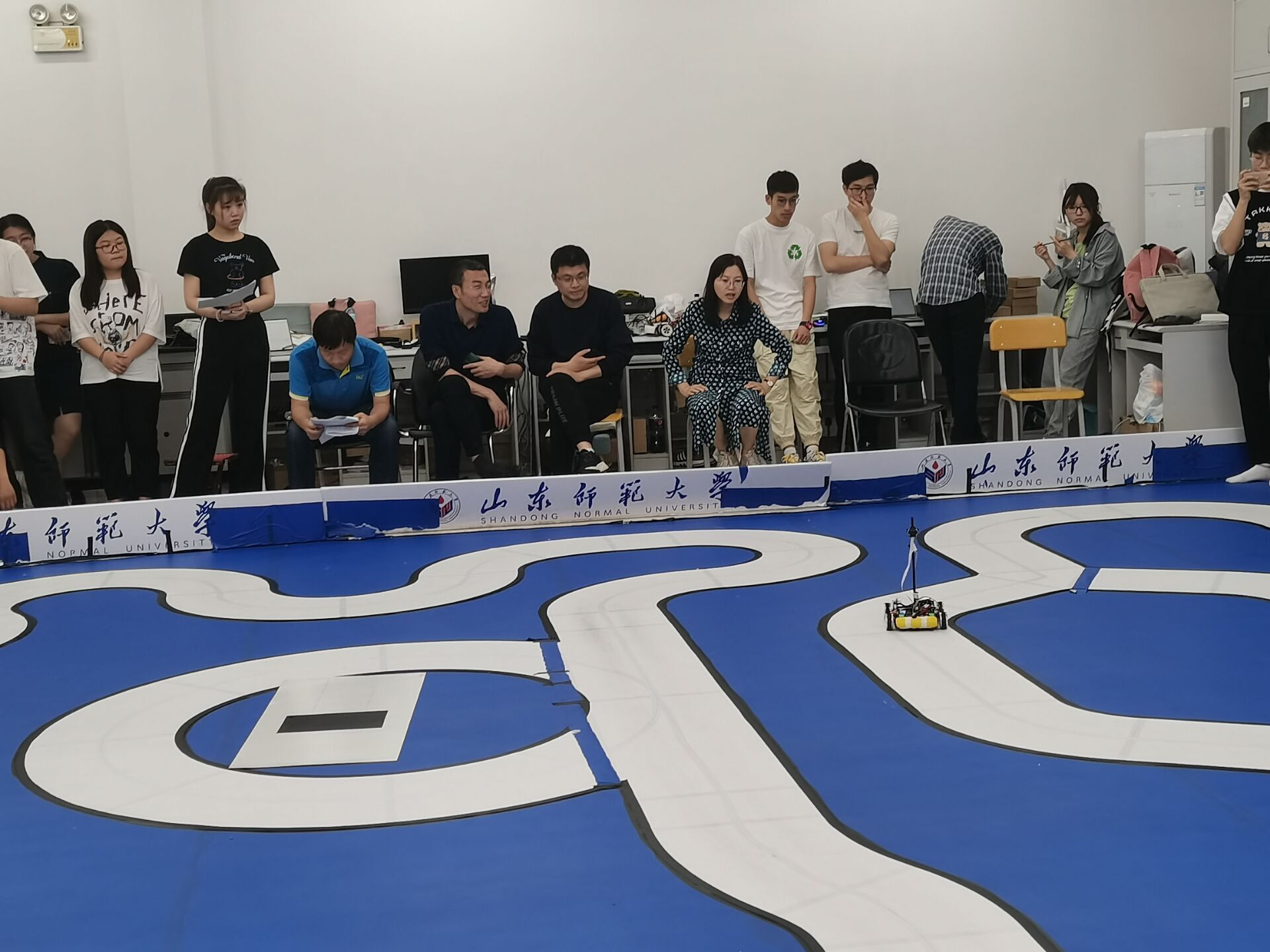 5月24日下午六点,山东师范大学智能车校内赛在文渊楼C区556教室举行。比赛由教务处主办,物理与电子科学学院承办。学院党委副书记杜伟、副院长赵曰峰、电子系主任王晶晶和指导教师团队在现场观摩指导。智能车竞赛难度大、趣味性强,从硬件电路设计到程序设计、再到机器学习、深度学习算法,极大提升了学生的专业综合水平和创新实践能力。
