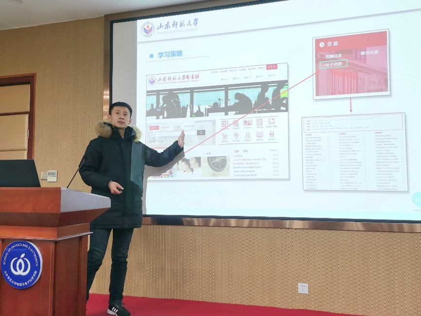 会议伊始,杨杨对21级新同学加入山东师范大学这个温暖的大家庭表示了欢迎,而后他从学习方法、学习时间规划、同学相处及学习心态等方面做了详细指导。杨杨重点向同学们介绍了如何利用学校图书馆提供的电子资源获取丰富学科知识和最新的学科进展,并就“中国知网”和“万方数据知识服务平台”的使用做了重点介绍,鼓励同学们利用图书馆的电子资源访问国际期刊,增强国际视野,拓展知识层面。