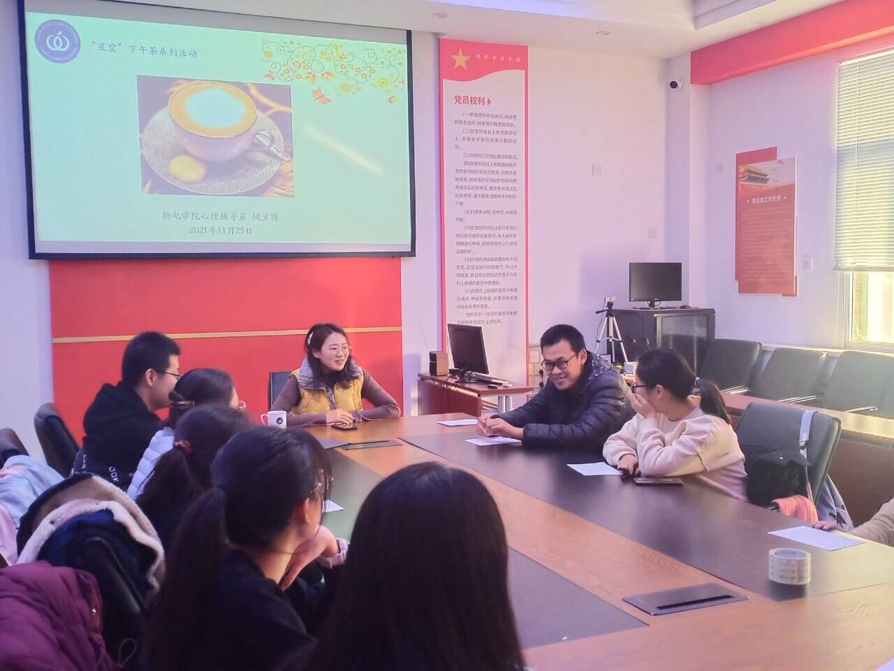 11月24日下午,物理与电子科学学院于文澜楼A区F311党建活动室举办第二十五期“星空下午茶”师生交流会,21级辅导员姚方园、21级博士生冯潇玥担任本次活动主讲人,二十余名同学到场参与活动。