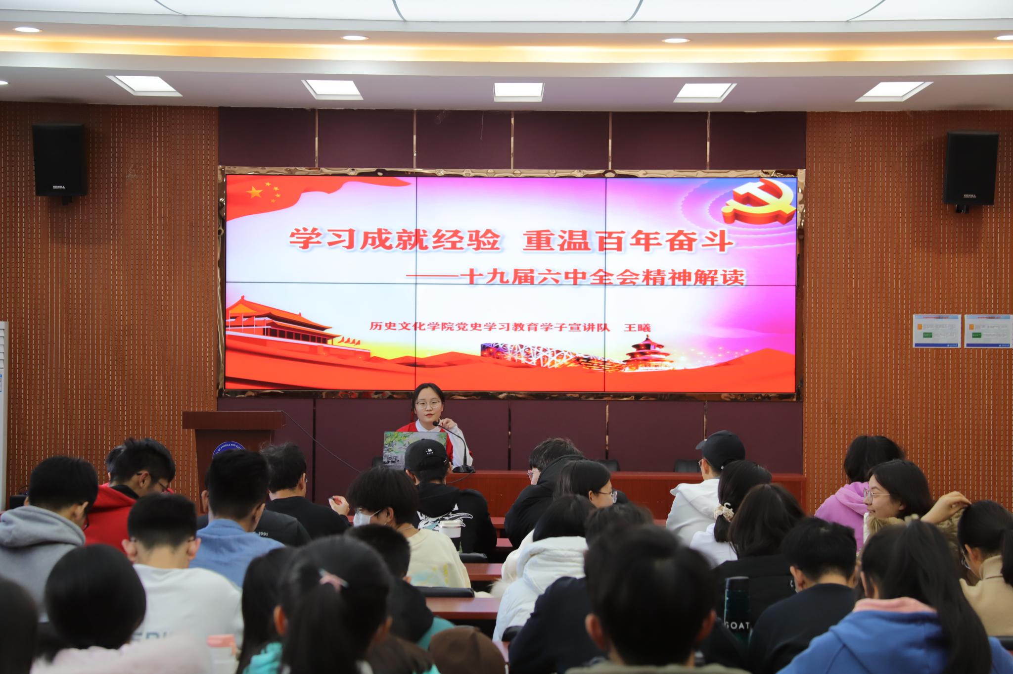 为深入学习中共十九届六中全会精神,弘扬伟大建党精神,12月3日中午,物理与电子科学学院于文澜楼A区F347召开中共十九届六中全会精神宣讲会。历史文化学院党史学习教育学子宣讲队王曦受邀担任主讲人,学院全体辅导员出席会议,80名学生参加本次活动。