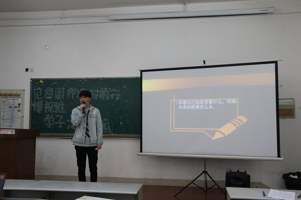 来自2013级电子信息工程一班董苏惠首先分享了自己的经验。她结合自己的经历,以“纸上得来终觉浅,绝知此事要躬行”等五句名言为主线,传达了学无止境的观念。接下来,2014级电子信息工程班包希浩分享了自己在竞赛、做班委、考研或就业的选择以及课余生活几个方面的心得体会。他告诫同学们:“尽管大学期间总会有不圆满之处,但是我们依然要努力不留遗憾。”接着,2014级电子信息工程一班刘子函总结了大学期间同学们能够参加的竞赛并做简要介绍。2014级电子信息科学与技术班董尧对这些竞赛进行补充说明,重点阐述了如何找导师和写大学生创新创业训练计划项目立项申请书。两位师哥师姐所讲内容使同学们对自己大学期间想参加的活动有了更多了解。最后成功保研北大的2013级物理二班韩旭讲述了自己保研的经历,她强调:“如果想保研从大一就要开始准备,必须保证成绩在年级的前十左右才会有希望。”韩旭还分享了面试的经验,给学弟学妹树立严谨求知的榜样。会后,每一位同学都留下了自己的联系方式,便于以后为师弟师妹答疑解惑。