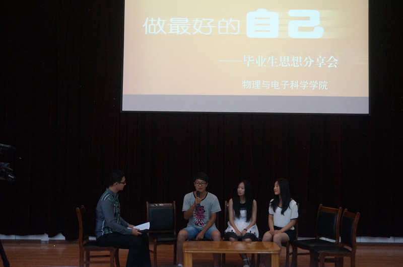 6月22日,物理与电子科学学院在综合教学区C154报告厅举办“做最好的自己”毕业生思想分享会。2010级辅导员潘磊,2014级辅导员方芳出席分享会,优秀毕业生代表与低年级同学分享了自己学习、工作与生活的经验。