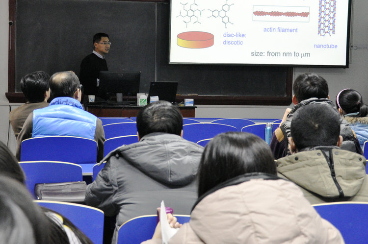 应山东师大物电学院原子与分子物理学科孟庆田教授的邀请,中国科学院物理研究所叶方富研究员于12月13-14日对我院进行了访问,并于13日下午在2215教室作了题为“液晶胶体及生物高分子网络中的分子取向关联”的专题报告。