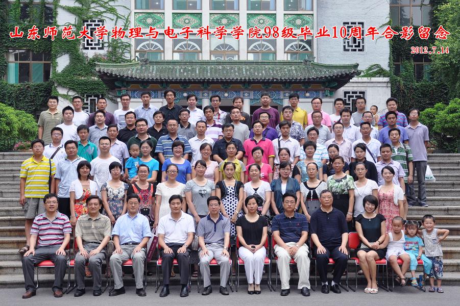 7月14日下午,二号教学楼2214教室里欢声笑语、热闹非常,物理与电子科学学院98级校友重归母校举行毕业十周年聚会。校长办公室副主任兼校友办主任邹波,副主任陈文亮,物电学院党委书记胡桂香,院长王传奎,副书记隋赤,副院长程传福,副院长王春兴,办公室主任崔洪泰出席聚会活动,管理科学与工程学院党委副书记、原物理系98级辅导员黄春霞与来自全国各地的98级校友欢聚一堂,一起回首十年前的大学时光,畅叙同学情,师生谊。