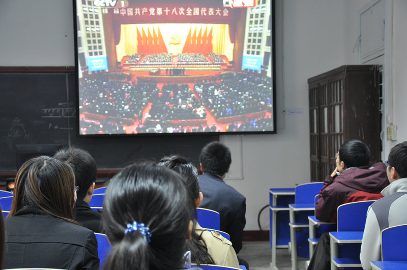 11月8日上午,物电学院在2215会议室组织职工、学生收看党的十八大开幕式盛况转播。庆祝党的十八大胜利召开。