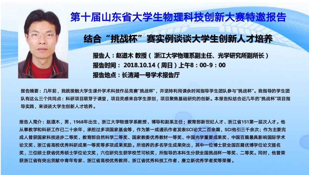 第十届山东省大学生物理科技创新大赛特邀报告:结合“挑战杯”赛实例谈谈大学生创新人才培养 赵道木教授(浙江大学物理系副主任、光学研究所副所长)