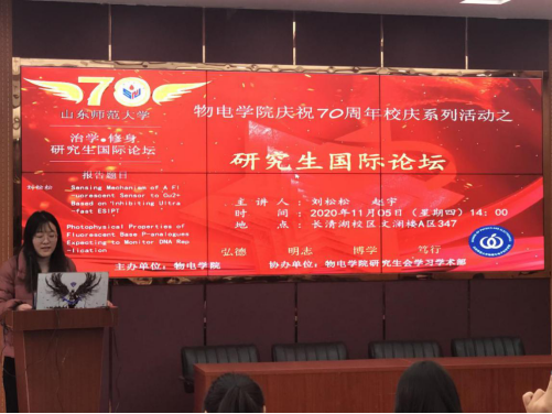 为加强学生间的学术交流与合作,提升研究生科研水平,11月5日,物理与电子科学学院于文澜楼A区347室举办70周年校庆系列活动之“研究生国际论坛”。优秀博士研究生刘松松、赵宇做了相关报告,此次论坛由研究生辅导员尹素月主持。