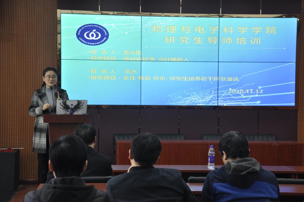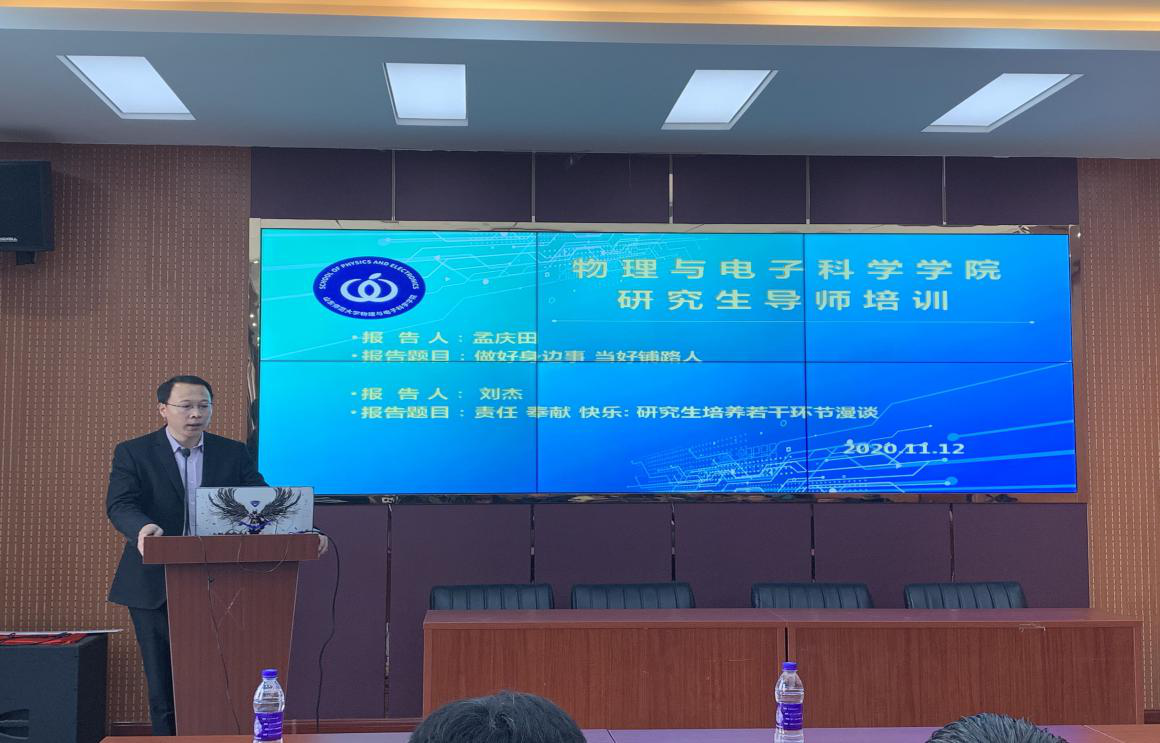 导师是研究生成为高质量人才的重要领航人,导师从学术研究到处事方法方方面面影响着学生。为了充分发挥导师在研究生教育工作中的作用,11月12日下午,物理与电子科学学院于文澜楼A区F347开展研究生导师培训工作,研究生导师孟庆田教授和刘杰教授为大家分享经验、交流心得,此次活动由副院长宋玉志主持,学院新遴选研究生导师参加了此次培训。
