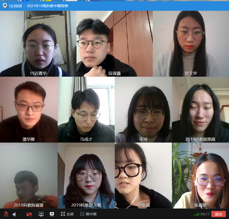 由于受到疫情的影响,学校积极响应国家疫情防控政策,号召学生错峰离校,物理与电子科学学院于1月15日下午举办2019级科学与技术教育专业的线上中期检查。本次检查是为了督促毕业生的论文写作进度,同时也对同学们在毕业论文写作过程中遇到的问题进行统一解答。本次参与答辩的有迟菁华等十二位同学,同时研究生导师李健、王书运、陈传松、杜军、高守宝等在线给同学们提出了建议,高守宝主持会议。