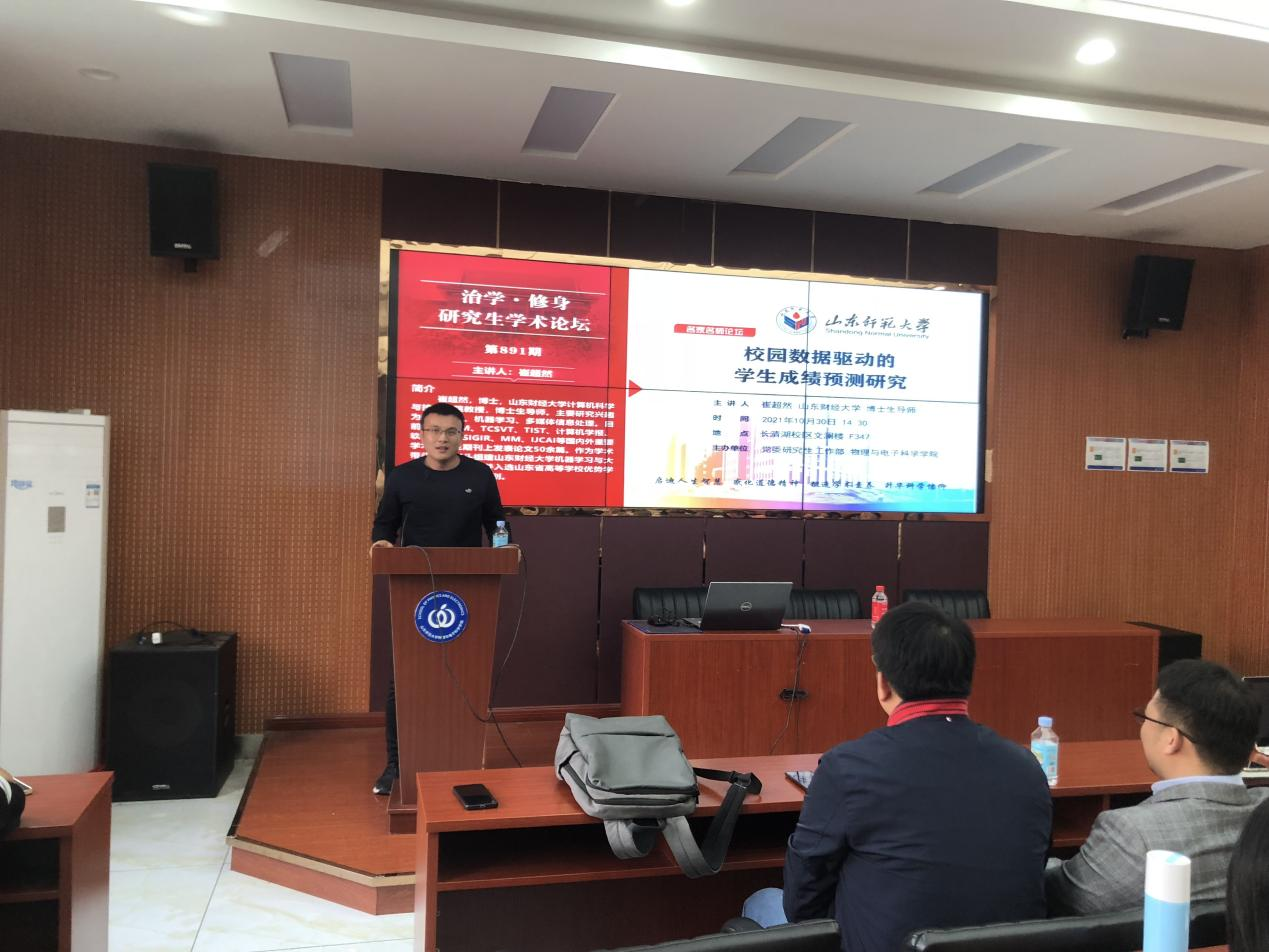 10月30日下午,第891、892期研究生治学修身学术论坛在文澜楼F347举行。山东财经大学崔超然教授、山东大学陈勐副教授分别做了主题为“校园数据驱动的学生成绩预测研究”与“编程教育与教育数据挖掘”的学术报告。本次学术论坛由物理与电子科学学院潘杰副教授主持,冷严副教授及部分研究生共同参与。