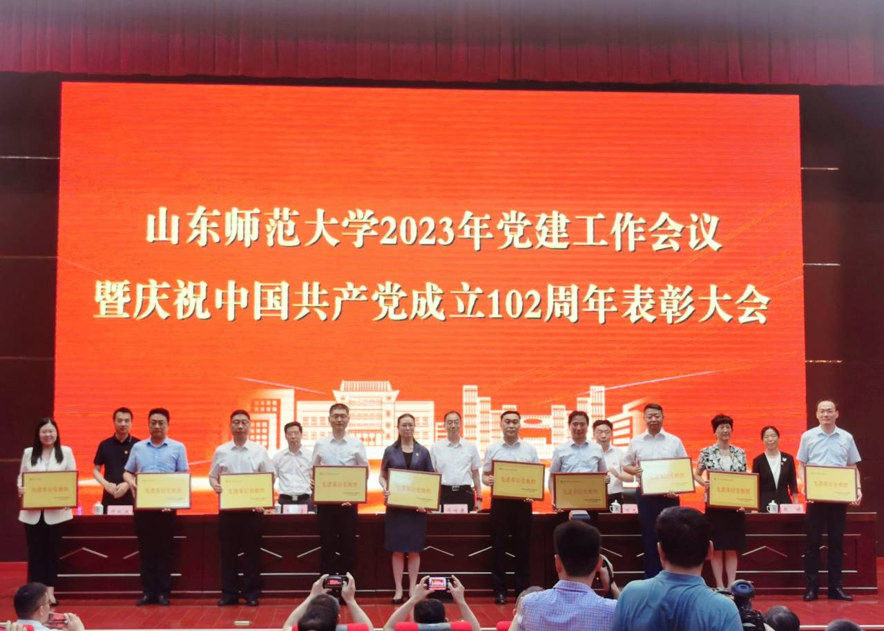 6月30日上午,山东师范大学庆祝中国共产党成立102周年表彰大会在千佛山校区教学三楼报告厅隆重举行。会上,对2023年获评的优秀共产党员、优秀党务工作者、先进基层党组织、校级党建工作样板支部和党员先锋岗(标兵)等进行了表彰。