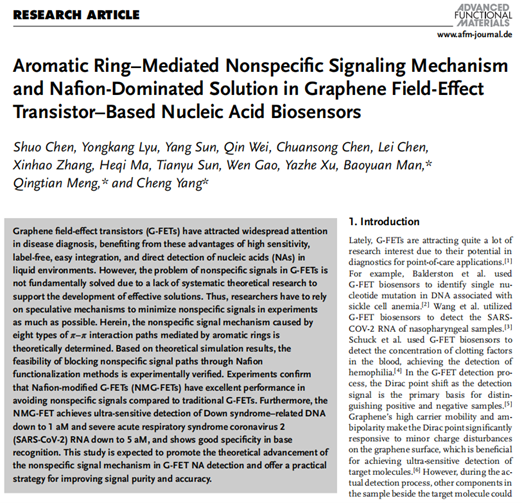 近日,学院满宝元教授团队和孟庆田教授团队合作在《Advanced Functional Materials》(IF = 19.924)上发表了题为“Aromatic Ring-Mediated Nonspecific Signaling Mechanism and Nafion-Dominated Solution in Graphene Field-Effect Transistor-Based Nucleic Acid Biosensors”的研究论文。山东师范大学为第一署名单位,第一作者为硕士生陈朔,通讯作者为满宝元教授、孟庆田教授和杨诚教授。 图1. 文章作者及摘要截图石墨烯场效应晶体管(...