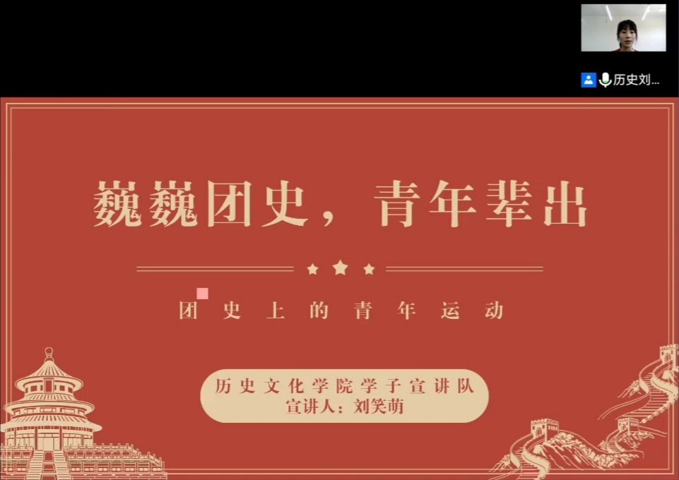 为引导广大青年学生更加直观形象地了解共青团历史,坚定青春理想,厚植爱党爱国情感。5月3日中午,物理与电子科学学院开展“团史上的青年运动”主题团聚青春团校培训活动,历史文化学院宣讲团成员刘笑萌担任活动主讲人,40余名团校学员“云端”参加本次活动。刘笑萌以中国共产主义青年团成立为切入点,紧紧围绕“巍巍团史,青年辈出”的主题展开讲述,通过几个历史事件为节点,带领大家回顾青年学生为抗日救亡所做出的巨大努力...