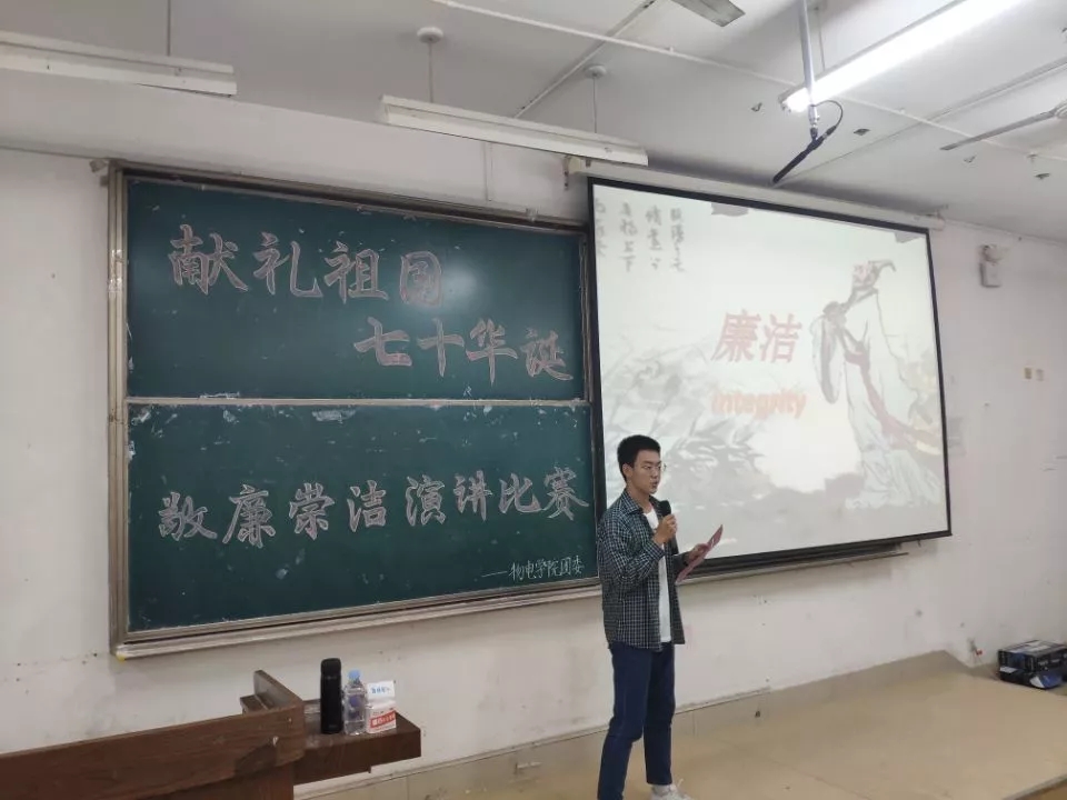 9月26日下午,为向新中国成立70周年献礼,K云体育官方入口在长清湖校区文渊楼举办“敬廉崇洁”演讲比赛。比赛由物电学院团委主办,学生会协办,18级辅导员杨岚、19级辅导员于双阳出席此次活动。本次活动参赛选手均是各班选拔出的优秀演讲者,他们精神抖擞、意气风发,演讲时声音洪亮、字正腔圆,洋溢着青春年少的活力,演绎着祖国花朵的风采。在演讲过程中,每一位演讲者对敬廉崇洁有着深刻且不同的认识,他们利...