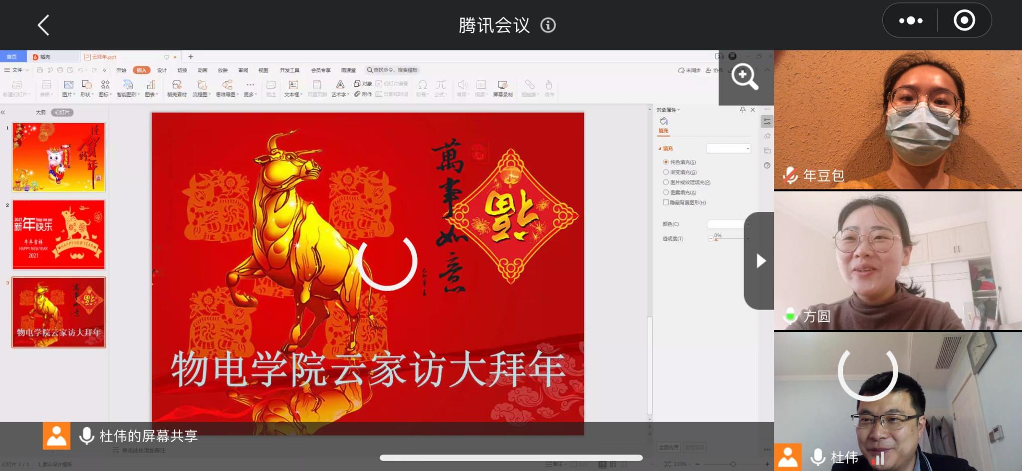 “玉鼠辞旧岁,金牛送春来”,为给物电学子送上新春的美好祝福,同时响应国家疫情防控的号召,2月12日上午,物理与电子科学学院举行线上“云拜年”活动。学院党委副书记杜伟,副院长任俊峰、宋玉志,团委书记周勇,各年级辅导员及20名学生参加本次活动。疫情防控一头连着安全大局,一头连着万家喜乐,在当前形势下,平安健康是最好的祝福。杜伟就学院领导和各位辅导员老师无法前往学生家中进行交流表示遗憾,但他同时指出,“人...
