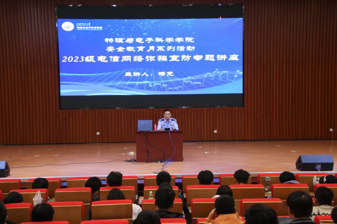 10月19日下午,物理与电子科学学院于文昌楼105报告厅举办电信网络诈骗宣防专题讲座。本次讲座由杨克警官主讲,党委副书记杜伟出席活动,辅导员于双阳、方芳与23级全体学生共同到场学习。杨克警官指出,电信诈骗已成为我国一种主要的犯罪类型,需要同学们对这次讲座保持重视。他向同学们分享现实中的电信诈骗案例,以此向同学们表明,电信诈骗不仅数额巨大,危害人民群众的财产安全,而且对学生的身心健康有害。他介绍了六种常见的诈骗类型,...
