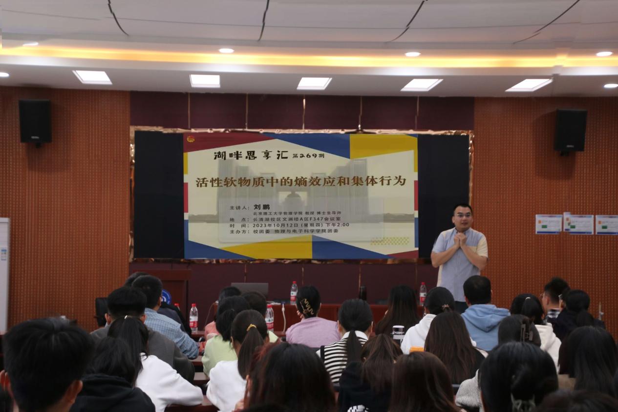 10月12号下午,物理与电子科学学院于文澜楼A区F347举办湖畔思享汇之“活性软物质中的熵效应和集体行为”专题讲座,北京理工大学顶级在线体育平台博士生导师刘鹏受邀担任本次讲座主讲人,学院副院长宋玉志出席,60名研究生和本科生参加讲座。刘鹏分别从研究背景、研究内容、研究成果、未来计划四个维度,层层递进,深入浅出地对活性软物质进行介绍。他指出,软物质是一种介于固体和液体之间的新型物质,具有可塑性、延展性、流变性和可逆性等特点。...