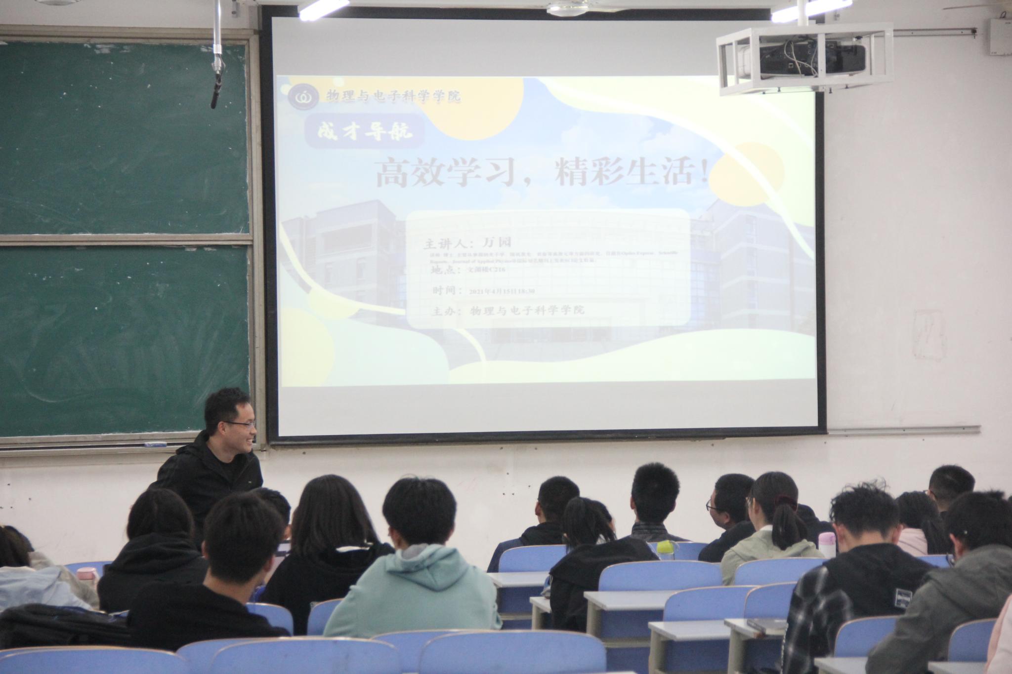 4月15日晚,物理与电子科学学院于文渊楼C337举办“高效学习,精彩生活”成才导航报告会。本次活动由学院讲师万园担任主讲人,100名学生到场参会。万园从“如何高效学习”及“如何精彩生活”两方面展开报告。对于高效学习,他展示了14年山师学子考研的照片,并强调道:学习没有捷径,但有方法。他建议同学们在学习遇阻时,选择合适的参考书,并通过“艾宾浩斯遗忘曲线”直观地展现了预习、复习的重要性。他由5W2H法切入,鼓励学...